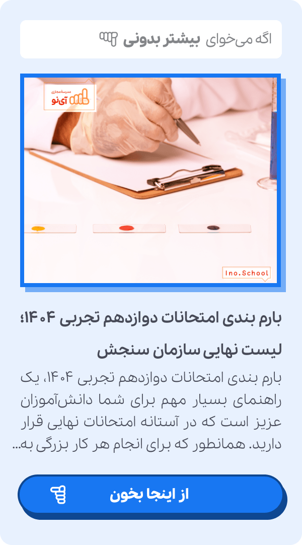 اگر در درسی احساس میکنید نیاز به توضیح بیشتری دارید، از منابع کمک آموزشی معتبر مانند ویدیوهای آموزشی آی نو استفاده کنید. این منابع میتوانند دریچههای جدیدی برای فهم بهتر مطالب به روی شما بگشایند.