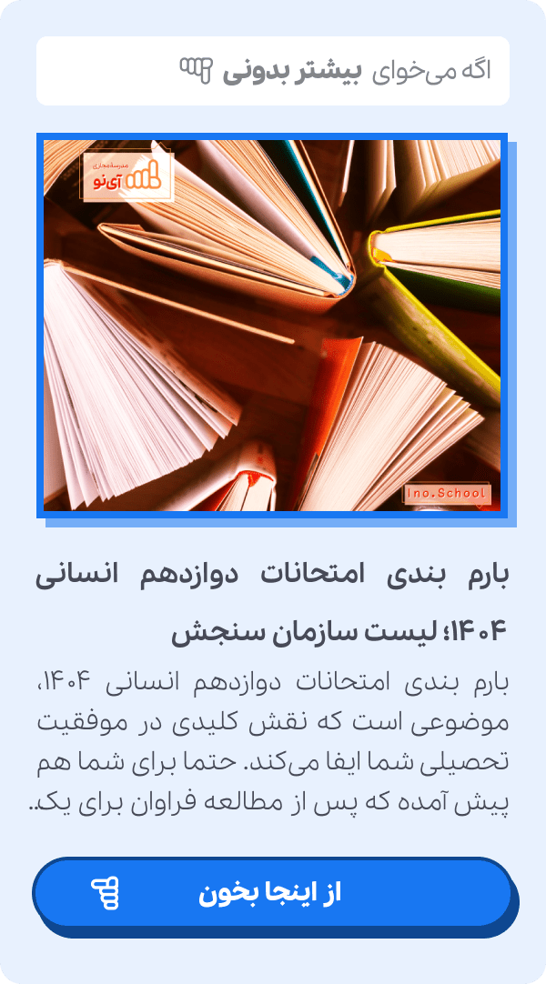 مدرسه مجازی آی نو در تمام این مسیر، همگام و همراه شماست. ما با ارائه ویدیوهای آموزشی جامع و با کیفیت، از شما حمایت می‌کنیم تا بهترین نسخه خودتان باشید. با آی نو، چالش‌های درسی را پشت سر بگذارید و با اطمینان خاطر به سوی آینده‌ای روشن قدم بردارید. یادگیری را با ما آسان کنید و بدانید که هرگز در این راه تنها نیستید. آی نو در کنار شماست تا با آمادگی کامل برای بارم بندی امتحانات دهم ریاضی ۱۴۰۴ و فراتر از آن، به اوج برسید و به تمامی اهدافتان دست یابید.