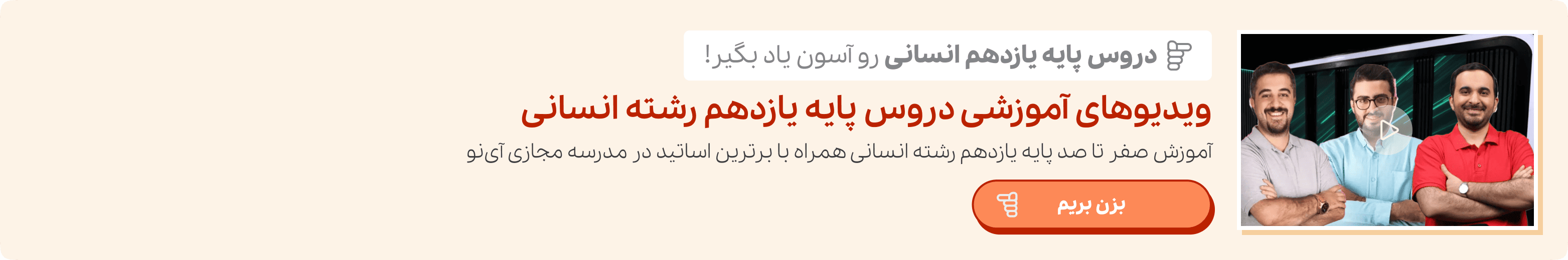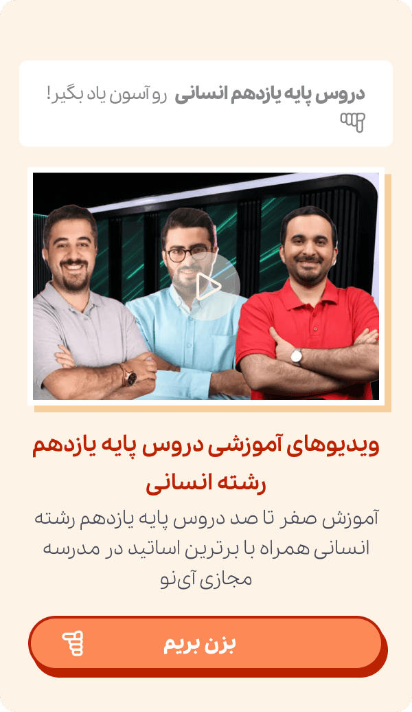 اگر شما هم تمایل دارید تا از ویدیوهای آموزشی پایه یازدهم رشته انسانی برای یادگیری دروس خود استفاده کنید، میتوانید با مراجعه به سایت مدرسه مجازی آی نو و تهیه اشتراک این مدرسه مجازی، پای تدریس برترین اساتید ایران بنشینید و مطالب کتاب درسی خود را به راحتی بیاموزید.