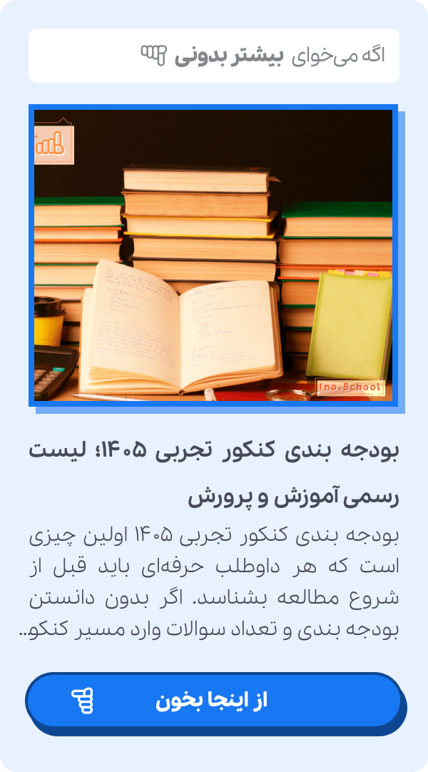 این چینش ثابت نیست، اما در سالهای اخیر تقریباً همین ساختار تکرار شده است و در مسیر بودجه بندی کنکور انسانی ۱۴۰۵ اهمیت زیادی دارد. اما باید این موضوع را در نظر داشته باشید که ممکن است تعداد سوالات با توجه به نظر طراحان سوال تغییر کند. بنابراین به شما توصیه میکنیم که تمام مطالب کتابهای عمومی و تخصصی خود را دقیق بخوانید و اگر نیاز به کمک دارید به سراغ تماشای ویدیوهای آموزشی مدرسه مجازی آی نو بروید.