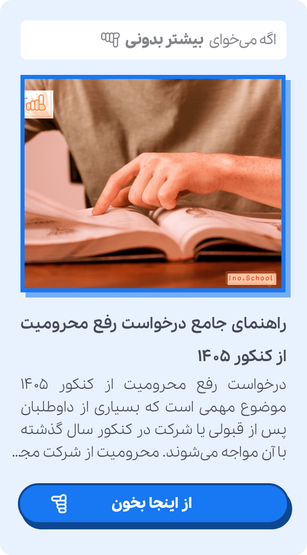 از یک مبحث کوچک گرفته تا یک آزمون جامع کامل! اینطوری هم نقاط ضعفتان را پیدا میکنید و هم برای روز کنکور سراسری حسابی آبدیده میشوید. وقت آن رسیده که با یک انتخاب هوشمندانه، مسیر موفقیتتان را هموارتر کنید. به خانواده بزرگ آی نو خوش آمدید. برای دیدن تاثیر سوابق تحصیلی در کنکور ۱۴۰۴ کلیک کنید.