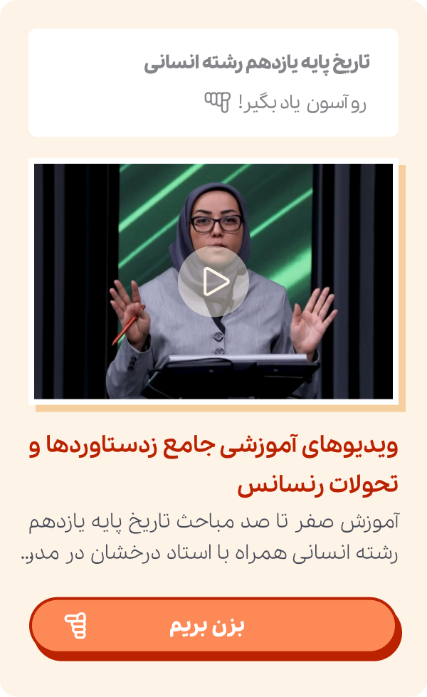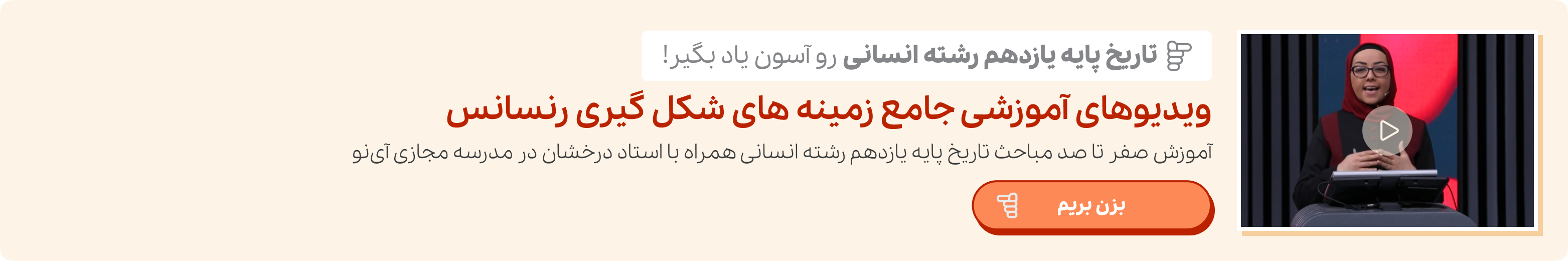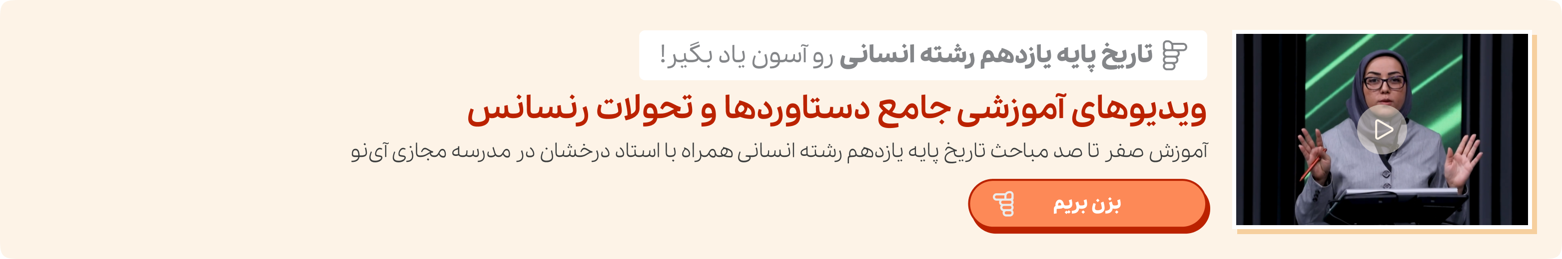 شما میتوانید با مطالعه خط به خط کتاب درسی تمام این مطالب درس رنسانس و عصر جدید تاریخ ۲ را به خوبی به حافظه بسپارید و با کمک فیلمهای آموزشی یادگیری خود را سریعتر و راحتتر کنید. برای استفاده از فیلمهای آموزشی باید به سایت مدرسه مجازی آی نو بروید. تمام دانش آموزان در سراسر کشور میتوانند از این امکان آموزشی به صورت نامحدود بهرهمند شوند.