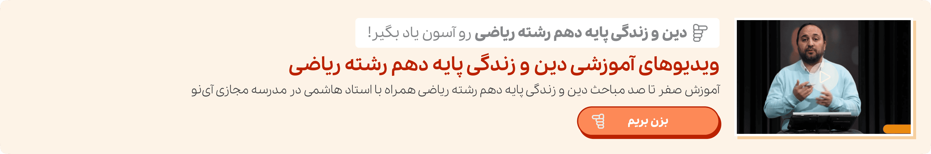 به یاد داشته باشید که یک شبه نمیتوان کتاب درسی دین و زندگی دهم ریاضی را به طور کامل فرا گرفت. در یافتن بهترین روش مطالعه دین و زندگی دهم ریاضی، مرور مطالب حرف اول و آخر را میزند. برای دسترسی به یک مرجع کامل، جهت مرور نکات طلایی دین و زندگی دهم، در هر زمانی از شبانهروز، کافیست به سایت مدرسه مجازی آی نو مراجعه نمایید و با مشاهدهی ویدیو آموزشی کتاب دین و زندگی دهم، از تجربیات دبیران حرفهای این مجموعه استفاده نمایید.