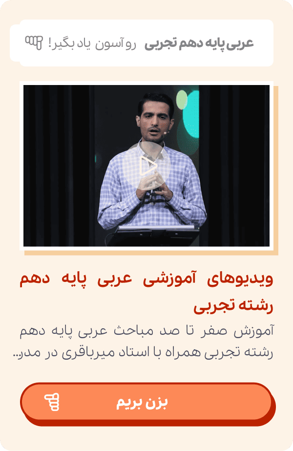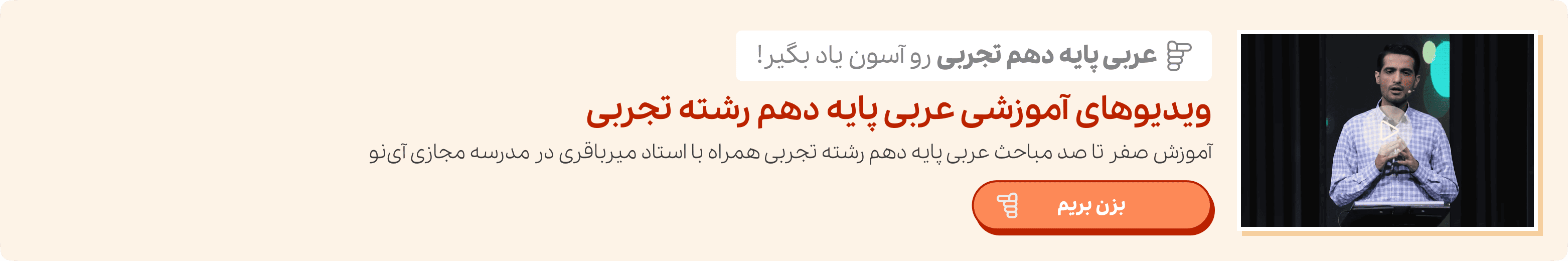 استفاده از ویدیو آموزشی عربی دهم تجربی، بهترین روش مطالعه عربی دهم تجربی است. مدرسه مجازی آی نو با بهرهمندی از بهترین مدرسین ایران، ویدیوهای آموزشی عربی دهم را به صورت مبحث به مبحث تهیه کرده است و آن را در اختیار دانش آموزان قرار داده است. اگر میخواهید بدانید چگونه عربی دهم را یاد بگیریم؟ بهتر است به سراغ ویدیوهای آموزشی مدرسه مجازی آی نو بروید و با کیفیت بالا آموزش ببینید.
