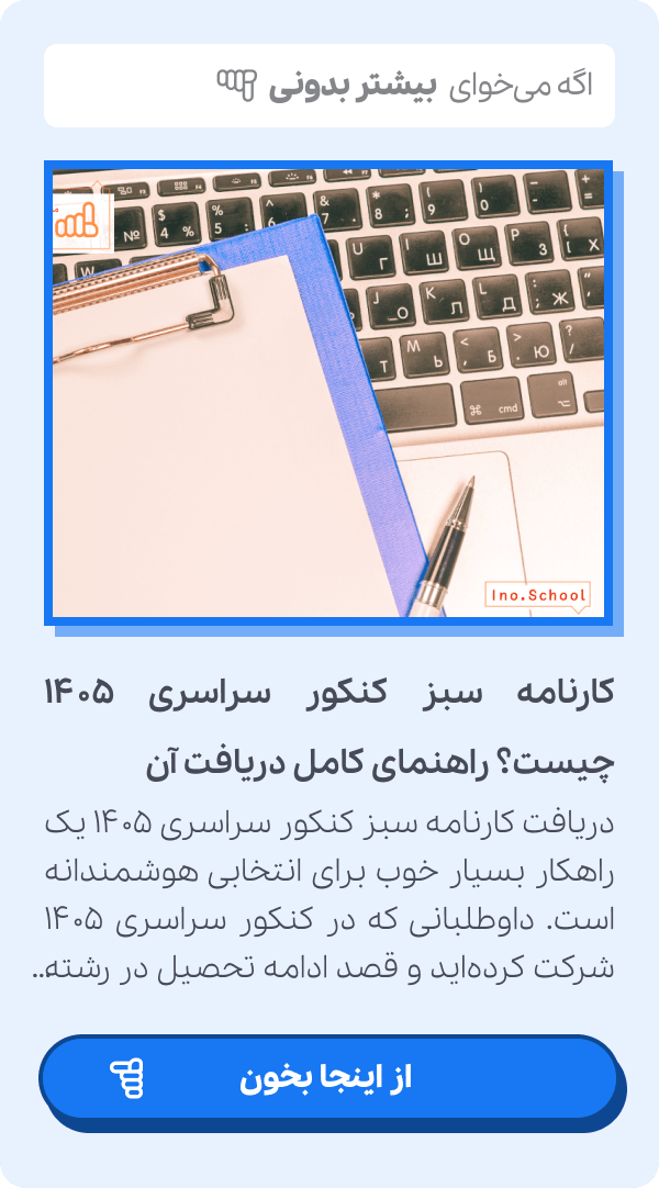 ما در مدرسه مجازی آی نو، با تمام وجود در کنار شما هستیم تا این مسیر را برایتان هموار کنیم. با تدریس بهترین اساتید کشور و ارائه بهروزترین محتوای آموزشی، تلاش میکنیم که هیچ چیز سخت و غیرقابل فهمی در کنکور سراسری ۱۴۰۵ وجود نداشته باشد. یادتان باشد که رمز اصلی موفقیت، در نظم، استمرار و پشتکار شما نهفته است، با این ویژگیها، قطعا برنده میدان خواهید بود.