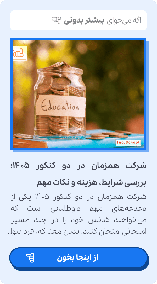 به یاد داشته باشید، اعلام نتایج نهایی کنکور در انتظار اقدام شماست. یک انتخاب نادرست، هرچند پرهزینه، بهتر از عدم انتخاب رشته کنکور ۱۴۰۵ است که به معنای از دست دادن کامل فرصت میباشد. با استفاده از ابزارها و مشاورههای تخصصی آی نو، قدمی محکم و علمی در مسیر تحصیل بردارید و با کسب موفقیت در اعلام نتایج نهایی کنکور سراسری، تلاش یک سالهتان را به ثمر برسانید. همین حالا اقدام کنید و برای آینده خود تصمیم بگیرید. اشتراک کنکور آی نو، راهکار قطعی شما برای انتخابی مطمئن و رسیدن به هدف است.