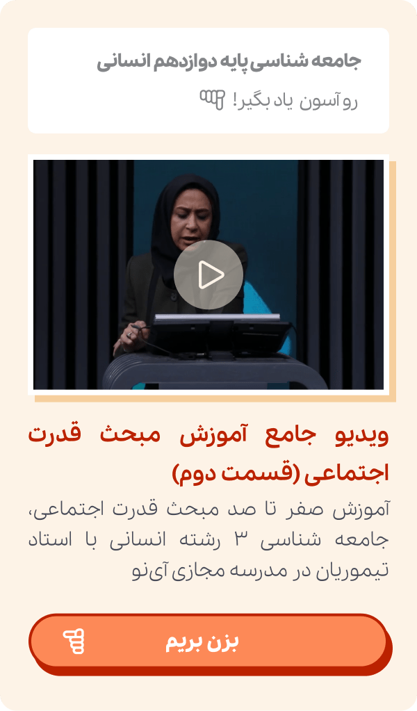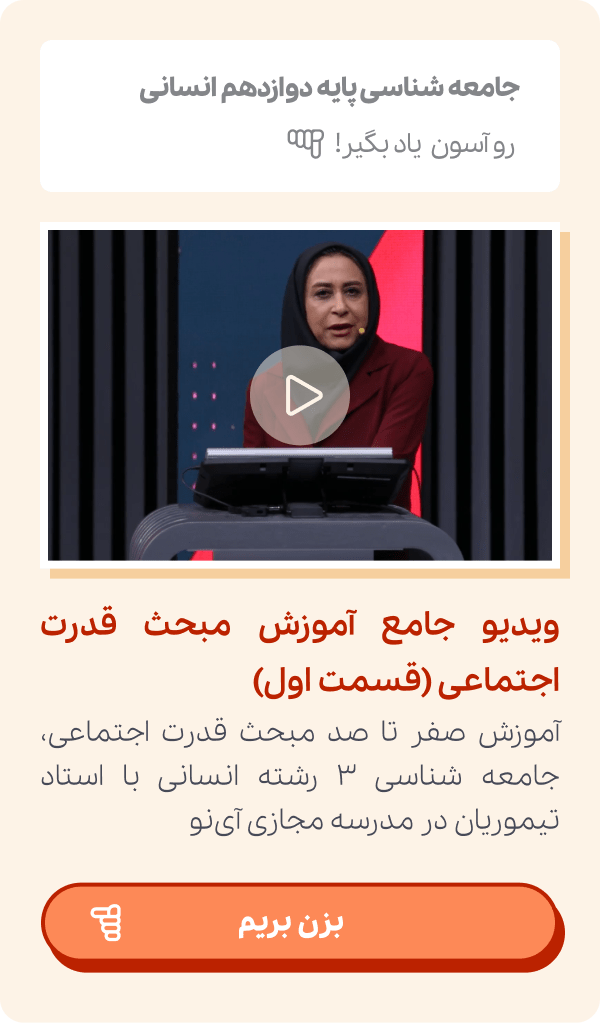 پس هرچه توان تاثیرگذاری بر افراد بیشتر باشد به این معناست که قدرت اجتماعی نیز بیشتر خواهد بود. تمام موارد در ویدیو آموزشی قدرت اجتماعی جامعه شناسی ۳ آورده شده است و شما میتوانید به راحتی و با مراجعه به سایت مدرسه مجازی آی نو به صورت نامحدود از ویدیوهای آموزشی جامعه شناسی دوازدهم انسانی استفاده کنید.