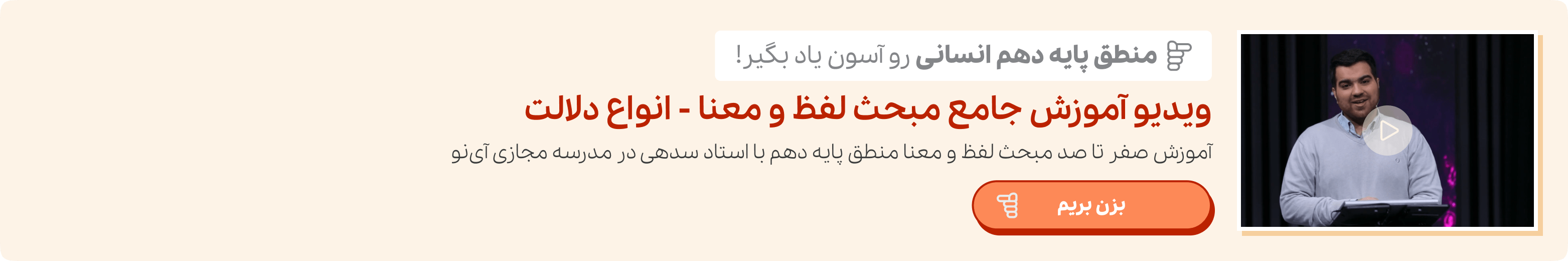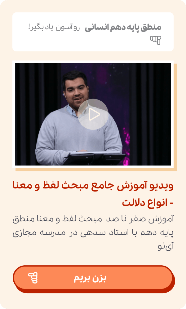 در این بخش شما با دلالت مطابقی، دلالت تضمنی و دلالت التزامی آشنا میشوید. درک مفهوم و نحوه استفاده از دلالت لفظ بر معنا بر اساس سه دلالت ذکر شده است و هدف این بخش میباشد. به طور عموم معمول دانش آموزان در درک و نحوه به کارگیری این دلالتها با مشکل مواجه میشوند و نیاز به آموزش بیشتر دارند. اگر شما هم در بخش نحوه دلالت لفظ بر معنا در جمله با مشکل مواجه شدهاید و آن را به خوبی درک نکردهاید به شما پیشنهاد میکنیم به سراغ ویدیوی آموزشی لفظ و معنا منطق دهم بروید و چندین بار این مبحث را همراه با مدرس مرور کنید تا آن را به خوبی درک کنید.