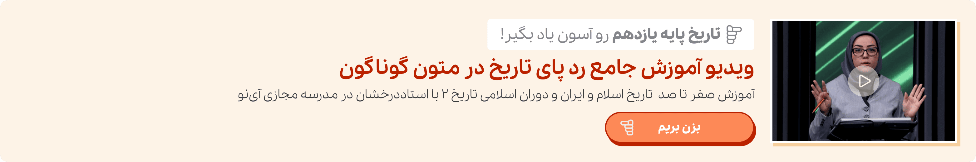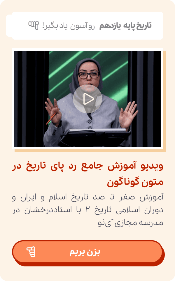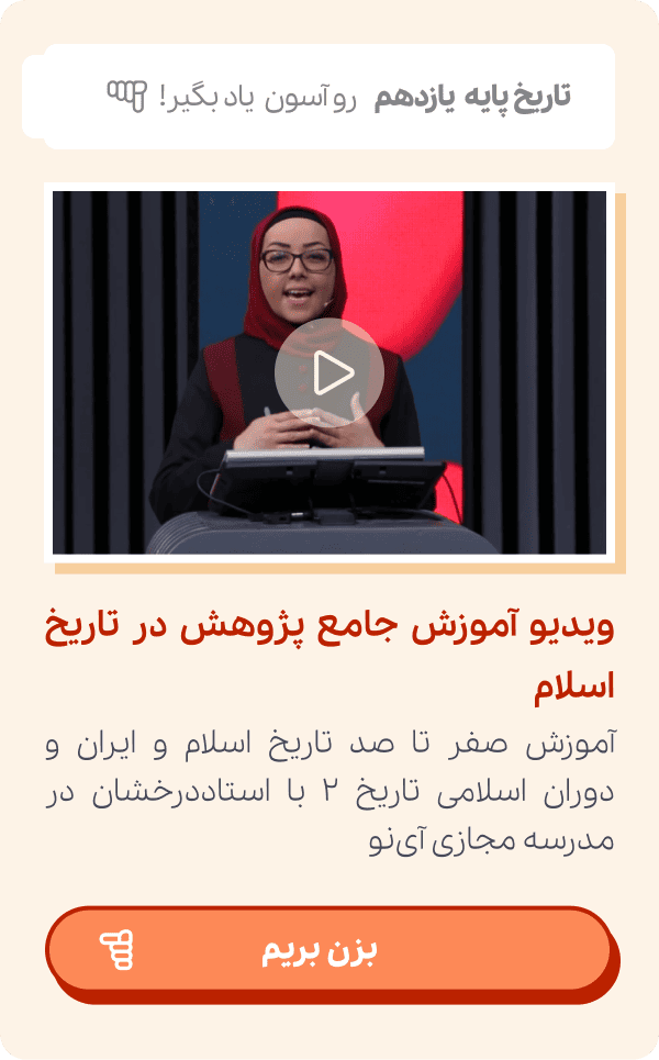 تهیه خلاصه منابع پژوهش در تاریخ اسلام و ایران دوران اسلامی تاریخ ۲ نیز در یادگیری مطالب درسی و مشخص کردن نقاط ضعف به شما کمک میکند. برای استفاده از فیلمهای آموزشی باید به سایت مدرسه مجازی آی نو بروید و بعد از انتخاب سال تحصیلی و درس تاریخ ۲ مشغول تماشای فیلمهای آموزشی به صورت نامحدود شوید. تمام دانش آموزان در سراسر کشور میتوانند از این فیلمهای آموزشی استفاده کنند.