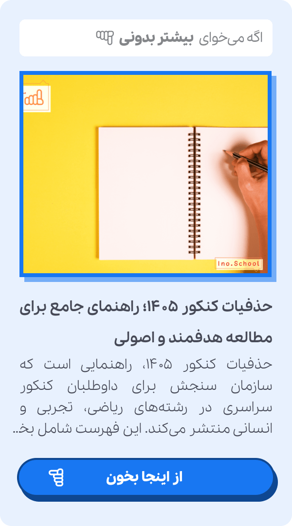 با وجود اینکه پذیرش در برخی رشتهها بر اساس سوابق تحصیلی صورت میگیرد، ورود به دانشگاهها و رشتههای برتر کشور همچنان از مسیر کنکور سراسری میگذرد. بنابراین، برای کسب رتبهای درخشان، تسلط کامل بر مباحث درسی و کسب مهارتهای پیشرفته در تستزنی امری ضروری است. افرادی که علاقهمند به رشته و دانشگاههای مطرح کشور میباشند، میتوانند برای دستیابی به این هدف، ویدیوهای آموزشی مدرسه مجازی آی نو را به عنوان یک مکمل قدرتمند در کنار کتابهای درسی خود قرار دهند و مسیر یادگیری خود را برای موفقیت در آزمون سراسری هموارتر سازند. همراه ما در این مقاله از آی نو باشید تا با بهترین منابع کنکور انسانی ۱۴۰۵ آشنا شوید.