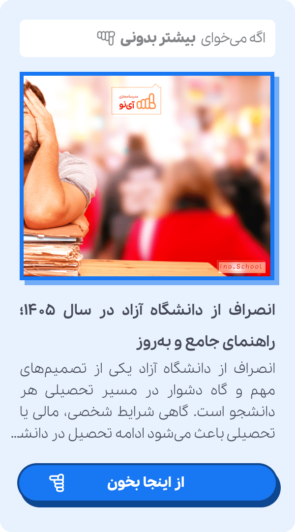 اگر شما قصد انصراف از دانشگاه را دارید و میخواهید برای سال آینده برنامهریزی مشخصی داشته و در کنکور سراسری پذیرفته شوید، باید از همین الان اقدام کنید. شما میتوانید با تهیه اشتراک کنکور آی نو زیر نظر برترین اساتید کنکور کشور درس بخوانید و با تماشای ویدیوهای آموزشی بسیار با کیفیت، خط به خط و نکته به نکته از مطالب کتابهای درسی خود را یاد بگیرید و با حل تمرین و حل نمونه سوالات امتحانی و حل نمونه سوالات کنکورهای سالهای گذشته، تسلط و مهارت خود را به مطالب درسی به طور چشمگیری افزایش دهید.