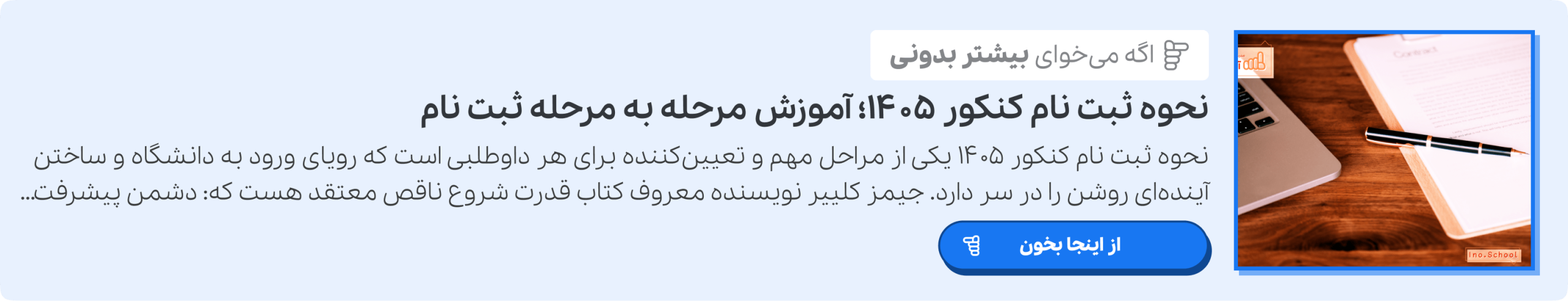 آی نو فراتر از آموزش است؛ با آی نو آزمون و آی نو پلاس، خود را بسنجید، پیشرفتتان را رصد کنید و نقاط ضعف را به قوت تبدیل سازید. همین حالا میتوانید به سایت آی نو مراجعه کنید و مسیر موفقیت خود را تضمین کنید. ما تا روز قبولی در کنکور کنار شما هستیم. برای آگاهی از اینکه بعد اشتباه در ثبت نام کنکور سراسری ۱۴۰۵ باید چیکار کنید، مقاله را بخوانید.