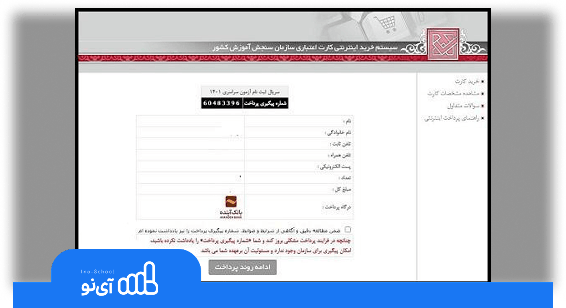 پس از اینکه شما این مبلغ را از طریق درگاه پرداخت الکترونیکی سازمان سنجش (epay.sanjesh.org) پرداخت میکنید، یک سریال و کدی به شما ارائه میشود که همان کد پرداختی است. این کد در حقیقت گواهی پرداخت شما برای شرکت در آزمون است و نقش مهمی در مراحل بعدی ثبت نام ایفا میکند.
