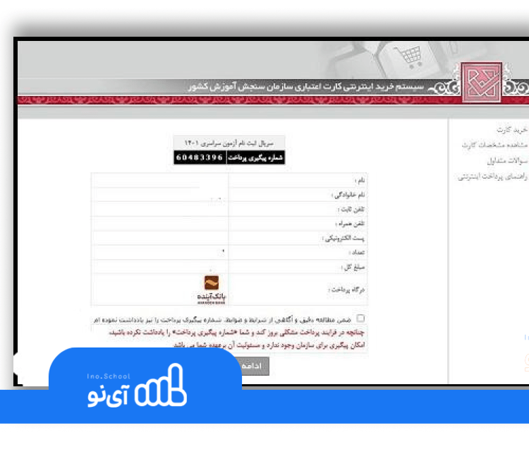 - اطلاعات کارت بانکی عضو شبکه شتاب خود را وارد کرده و هزینه ثبت نام کنکور ۱۴۰۵ را پرداخت نمایید.