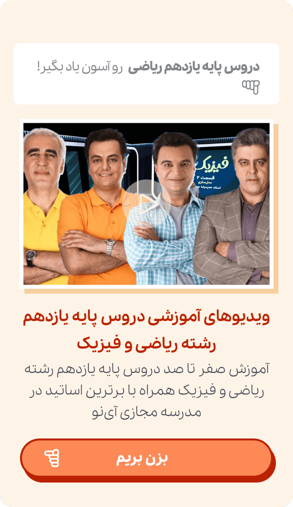 برای استفاده از ویدیوهای آموزشی پایه یازدهم رشته ریاضی، میتوانید به سایت مدرسه مجازی آی نو مراجعه کرده و ضمن تهیه اشتراک این مدرسه مجازی از امکانات آموزشی آن استفاده کنید. بهتر است در هنگام نوشتن برنامه ریزی درسی پایه یازدهم ریاضی، زمانهایی که صرف مشاهده ویدیوهای آموزشی میشود را نیز لحاظ کنید، تا در طول هفته برای مطالعه سایر دروس خود زمان کم نیاورید.