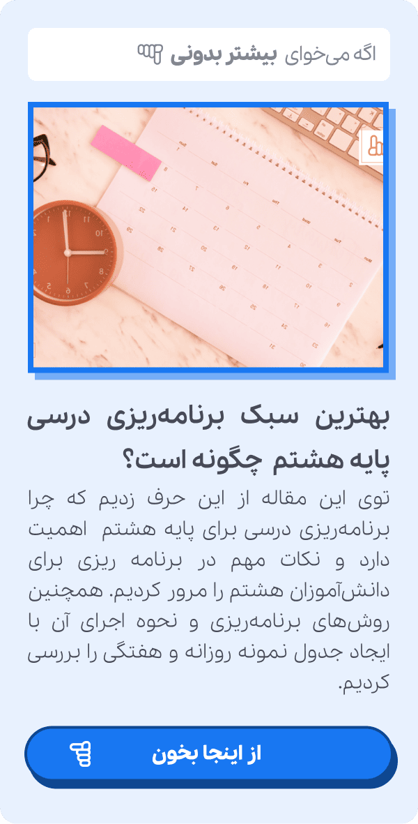 در بهترین روش مطالعه فارسی هشتم، داشتن مطالعه روزانه تا حد زیادی مشکلات شما را در این درس برطرف خواهد کرد و به شما کمک میکند تا به راحتی مطالب مهم و نسبتا سخت این کتاب را یاد بگیرید. زمان مطالعه روزانه باید کوتاه باشد، تا باعث ایجاد احساس خستگی در شما نشود. کافیست روزی ۳۰ دقیقه را به خواندن درس فارسی اختصاص دهید، به این شکل، میتوانید مطمئن باشید تا قبل از شروع امتحانات، تمام نکات مهم درس فارسی را به طور کامل یاد گرفتهاید.