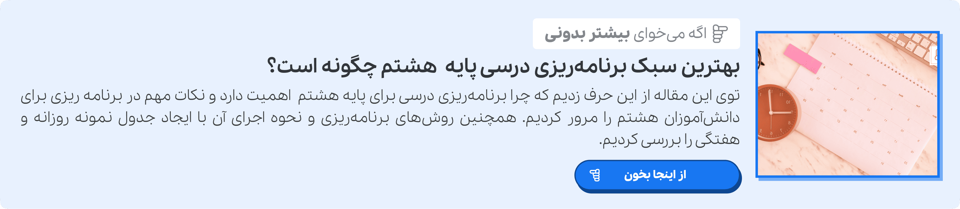 دیگر از موارد بسیار مهمی که باید در هنگام یادگیری درس فارسی به آن اشاره کرد، داشتن برنامهریزی است. در بهترین روش یادگیری فارسی هشتم، لازم است تا سرفصلهای کتاب را در نظر بگیرید و متناسب با حجم هر فصل از کتاب، زمان کافی برای مطالعه را به آن اختصاص دهید.