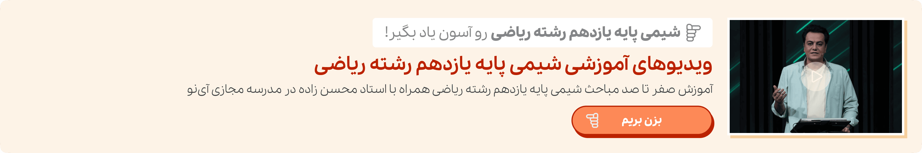 فراموش نکنید که شما در تمامی مراحل خواندن، مرور، انجام آزمایش، فهم آن و حل تمرینات نیاز به یک منبع صحیح و استاندارد خواهید داشت تا بتوانید به همراه این مرجع معتبر، به حل مشکلات کتاب شیمی یازدهم، دسترسی داشته باشید. در این راستا کافی است به سایت مدرسه مجازی آی نو مراجعه کنید و ویدئو آموزشی شیمی یازدهم ریاضی را مشاهده نمایید.