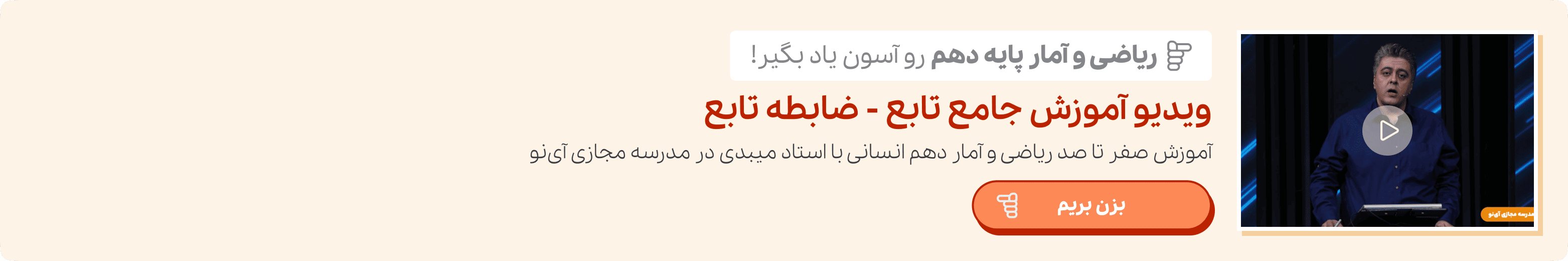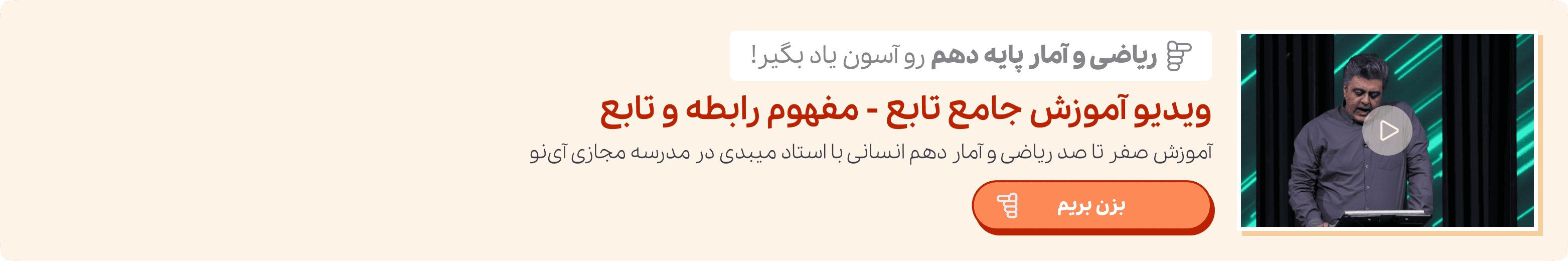 اگر برای یادگیری مطالب این بخش از کتاب ریاضی و آمار دهم انسانی نیاز به تکرار و توضیح بیشتری دارید می‌توانید از آموزش ویدیویی تابع ریاضی و آمار ۱ استفاده کنید و پا به پای اساتید برتر ایران مفهوم تابع را یاد بگیرید. یادگیری درست و اصولی به شما کمک می‌کند تا در سال‌های آینده نیز با مفهوم تابع مشکلی نداشته باشید.